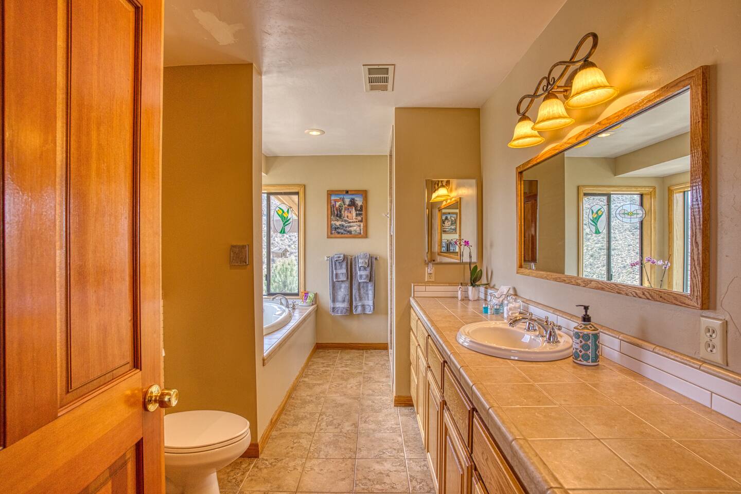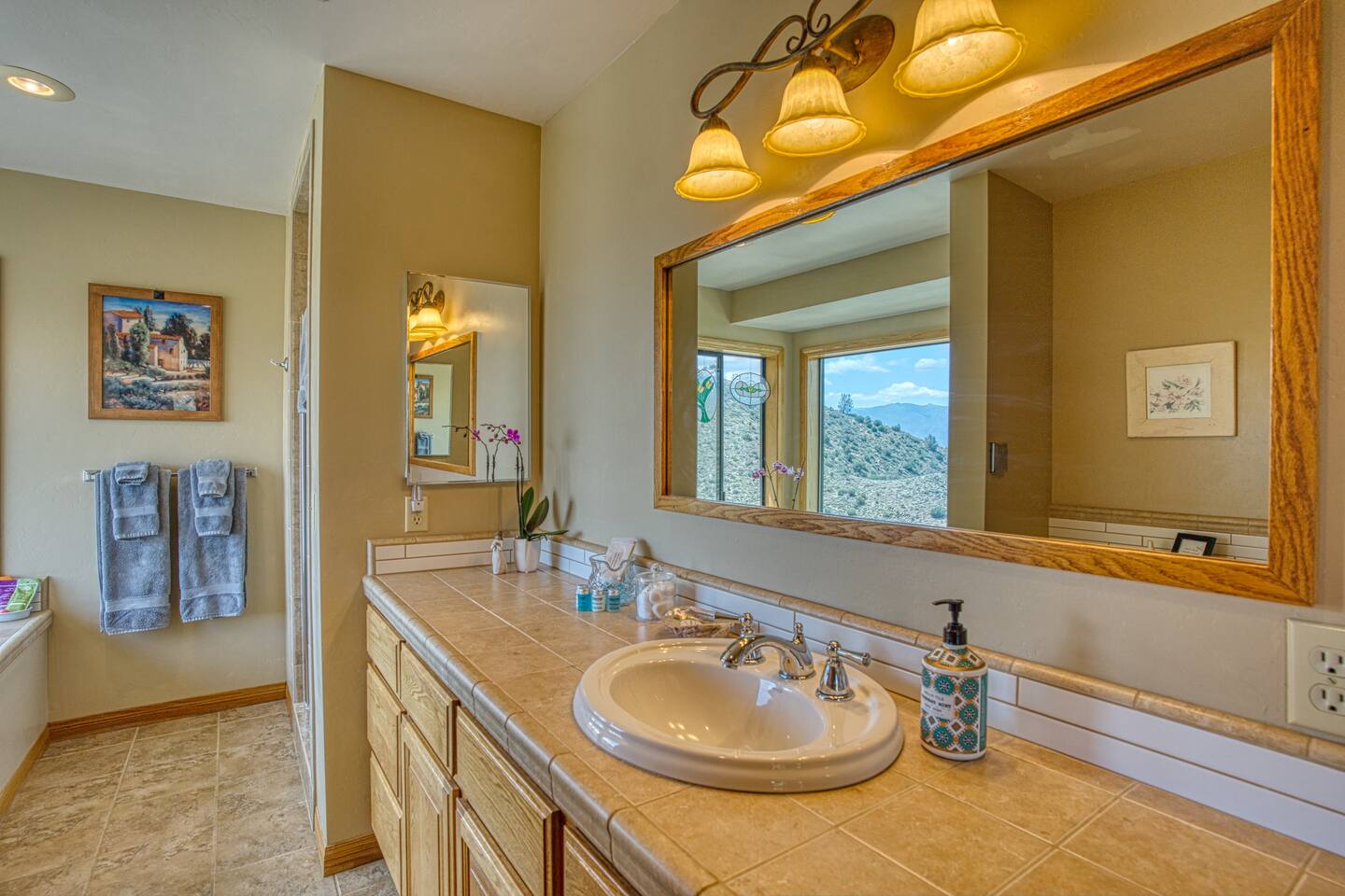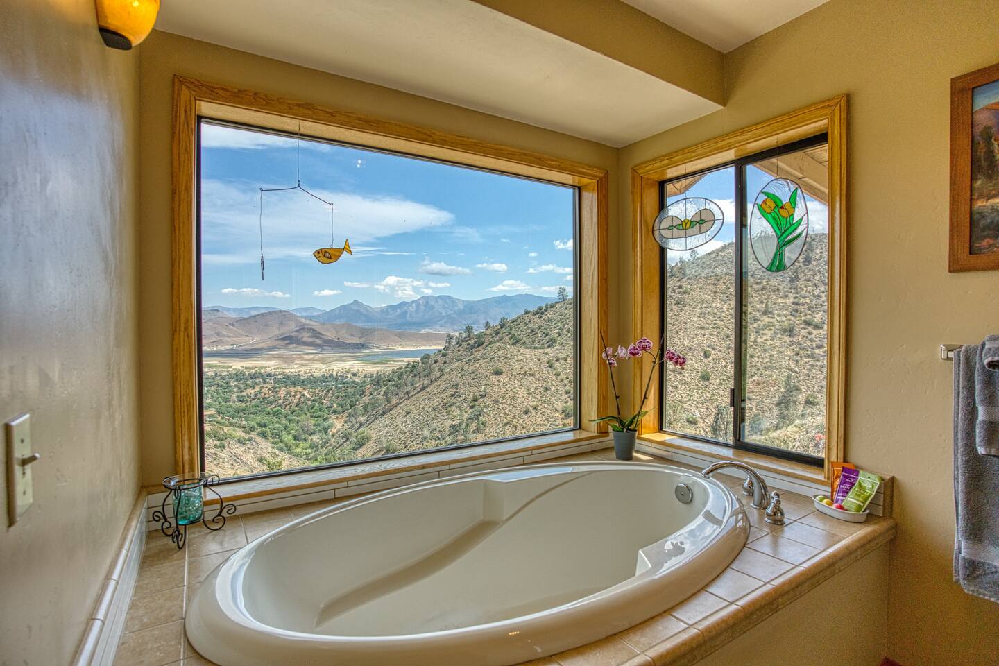 * A large soaker tub with panoramic views overlooking the lake and valley