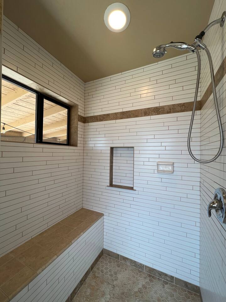 * A walk-in tiled shower