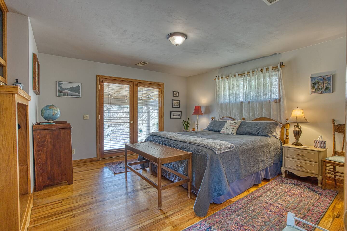 The bedroom features a comfortable king-size bed and French doors that open directly to the back patio—perfect for relaxing, grilling a meal, and enjoying the quiet mountain setting.